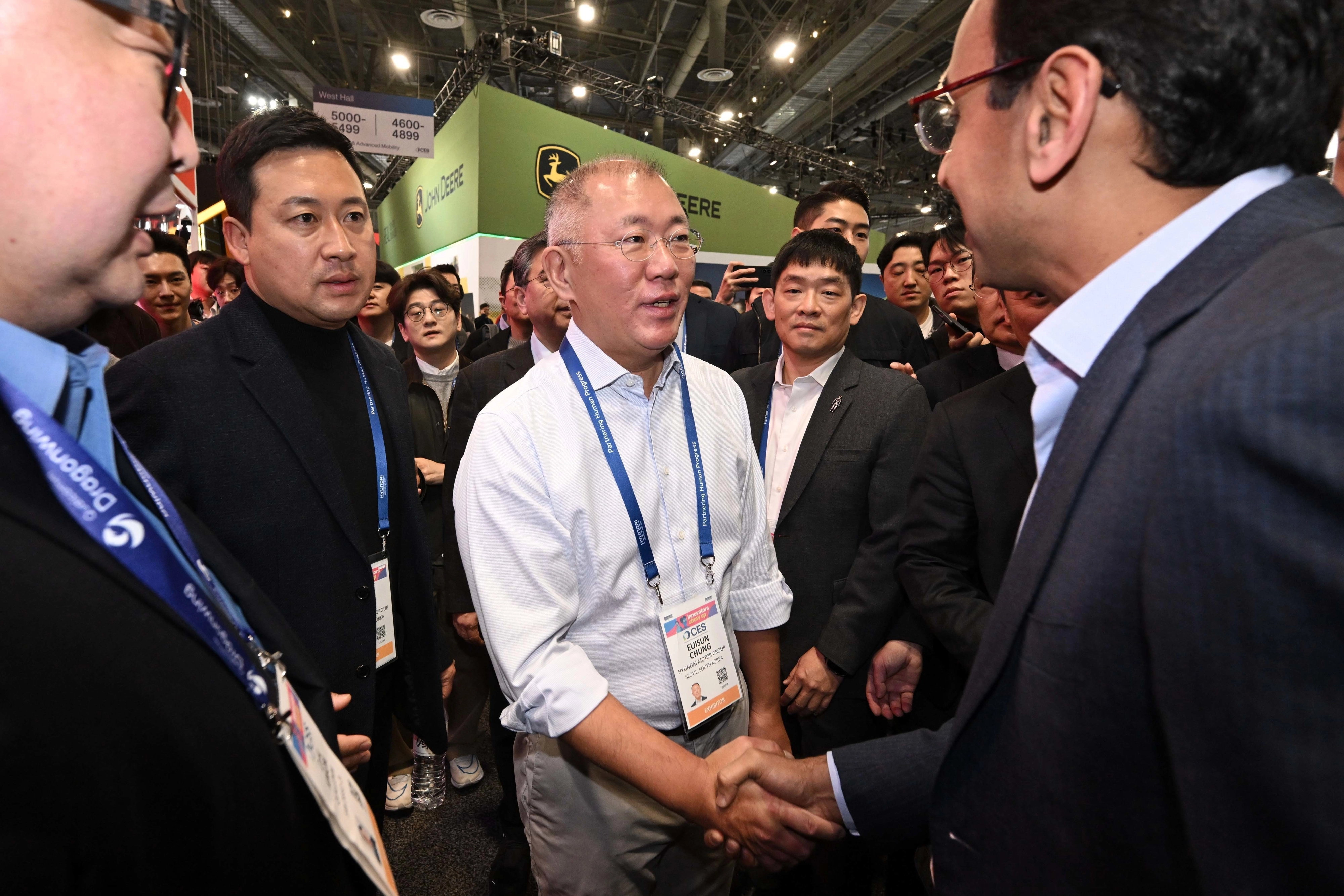 정 회장은 이재명 대통령의 중국 방문 경제사절단으로 동행한 뒤 곧바로 미국으로 이동해 이날 라스베이거스컨벤션센터와 윈호텔 등을 찾았다. 정 회장은 퐁텐블로호텔에 마련된 엔비디아 전시관에서 전날 황 CEO가 발표한 엔비디아의 첫 자율주행 플랫폼 ‘알파마요’에 대한 안내를 유심히 청취한 뒤, 황 CEO와 만나 약 30여분간 대화를 나누었다. 이후 취재진의 질문에는 대답하지 않고 자리를 떴다.