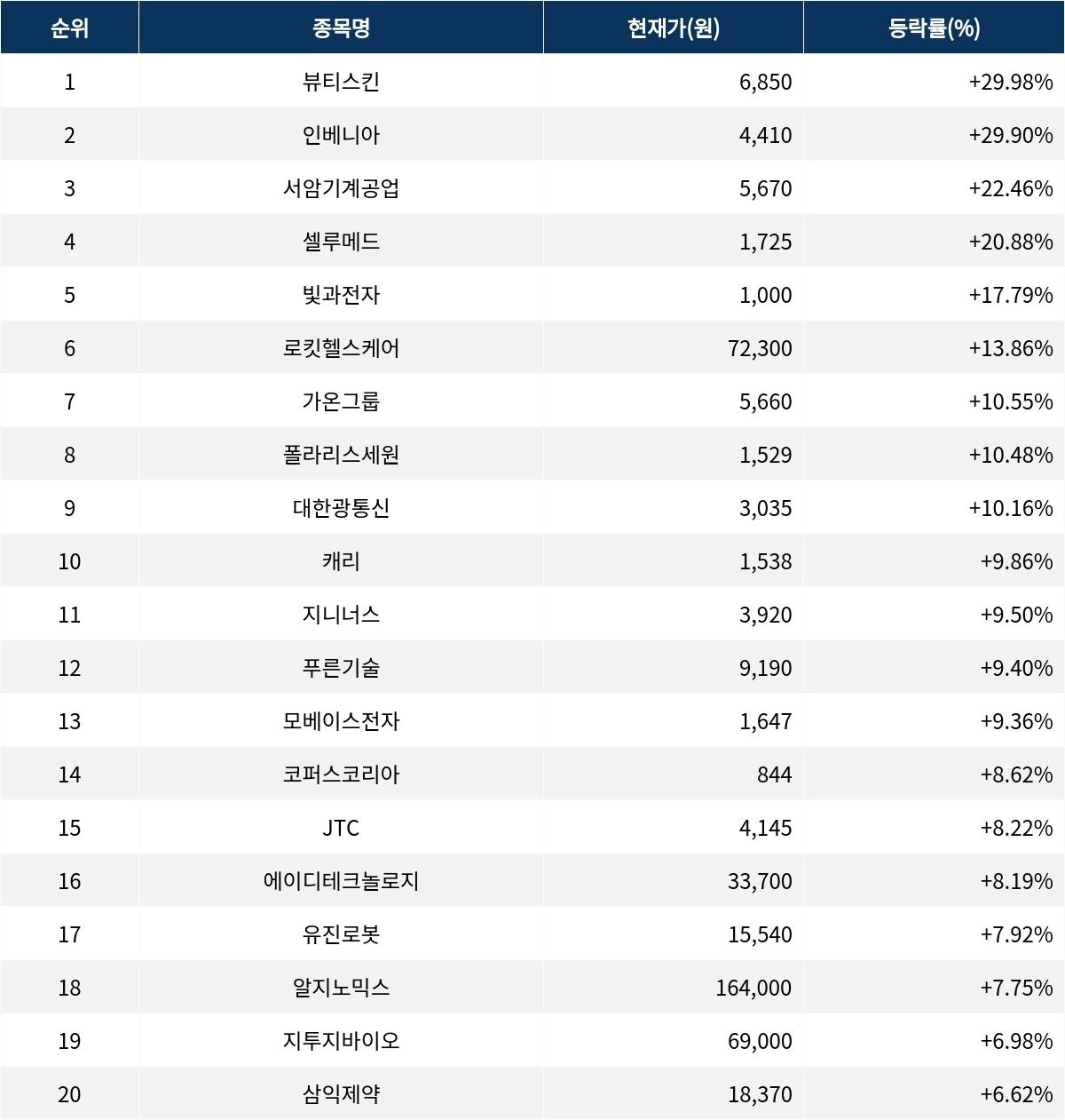 6위 로킷헬스케어(376900)는 현재가 7만 2300원으로 13.86% 급등 중이다. 7위 가온그룹(078890)은 현재가 5660원으로 10.55% 상승 중이다. 8위 폴라리스세원(234100)은 현재가 1529원으로 10.48% 상승 중이다. 9위 대한광통신(010170)은 현재가 3035원으로 10.16% 상승 중이다. 10위 캐리(313760)는 현재가 1538원으로 9.86% 상승 중이다.