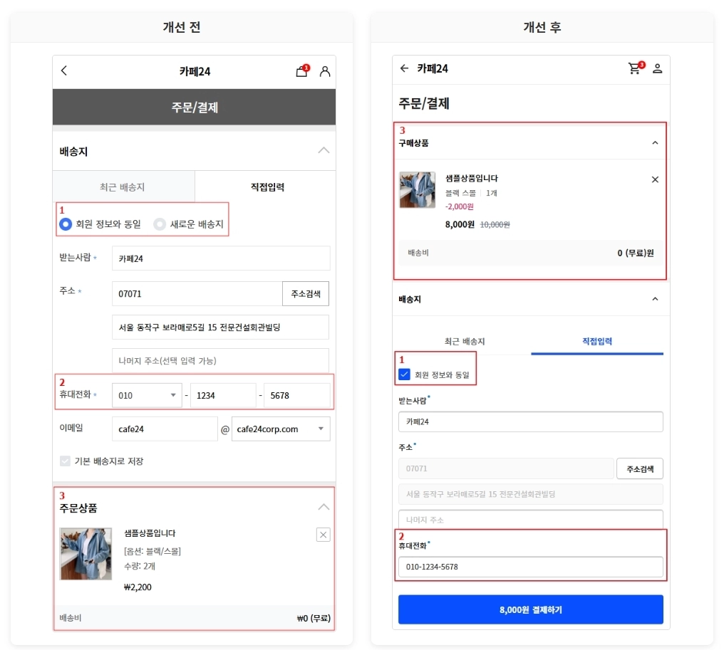 주문서 화면 전반의 사용자 경험도 개선했다. 배송지 입력 시 ‘주문자 정보와 동일’ 옵션을 하나로 통합하고, 전화번호 입력 방식을 간소화해 불편함을 줄였다. 상품 정보는 가장 상단에 배치하고 상품명, 옵션, 수량 등을 간결하고 명확하게 정리해 가독성을 높였다.