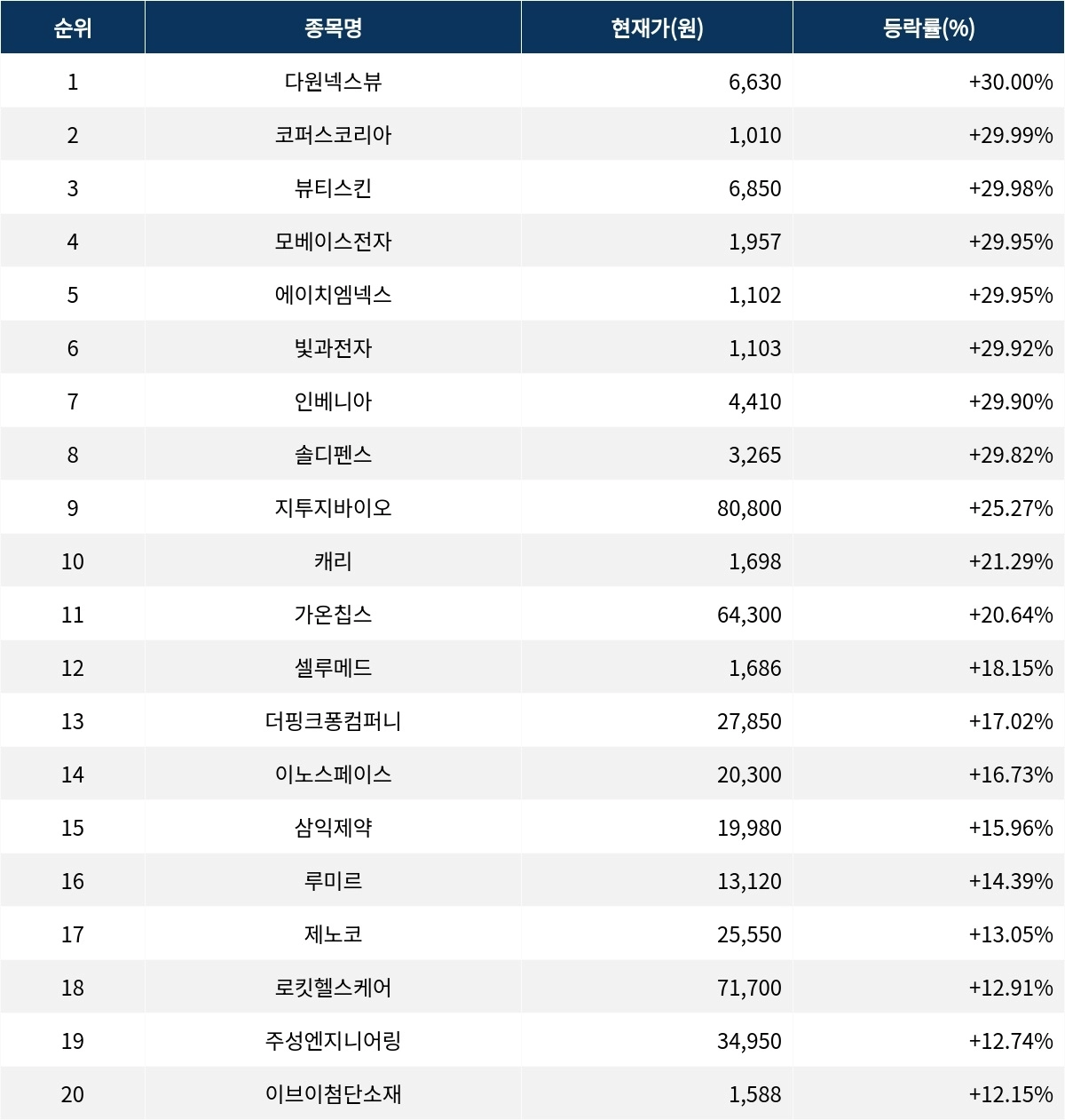 6위 빛과전자(069540)는 종가 1,103원으로 +29.92% 상승 마감했다. 7위 인베니아(079950)는 종가 4,410원으로 +29.90% 상승했다. 8위 솔디펜스(215090)는 종가 3,265원으로 +29.82% 상승했다. 9위 지투지바이오(456160)는 종가 80,800원으로 +25.27% 상승했다. 10위 캐리(313760)는 종가 1,698원으로 +21.29% 상승했다.