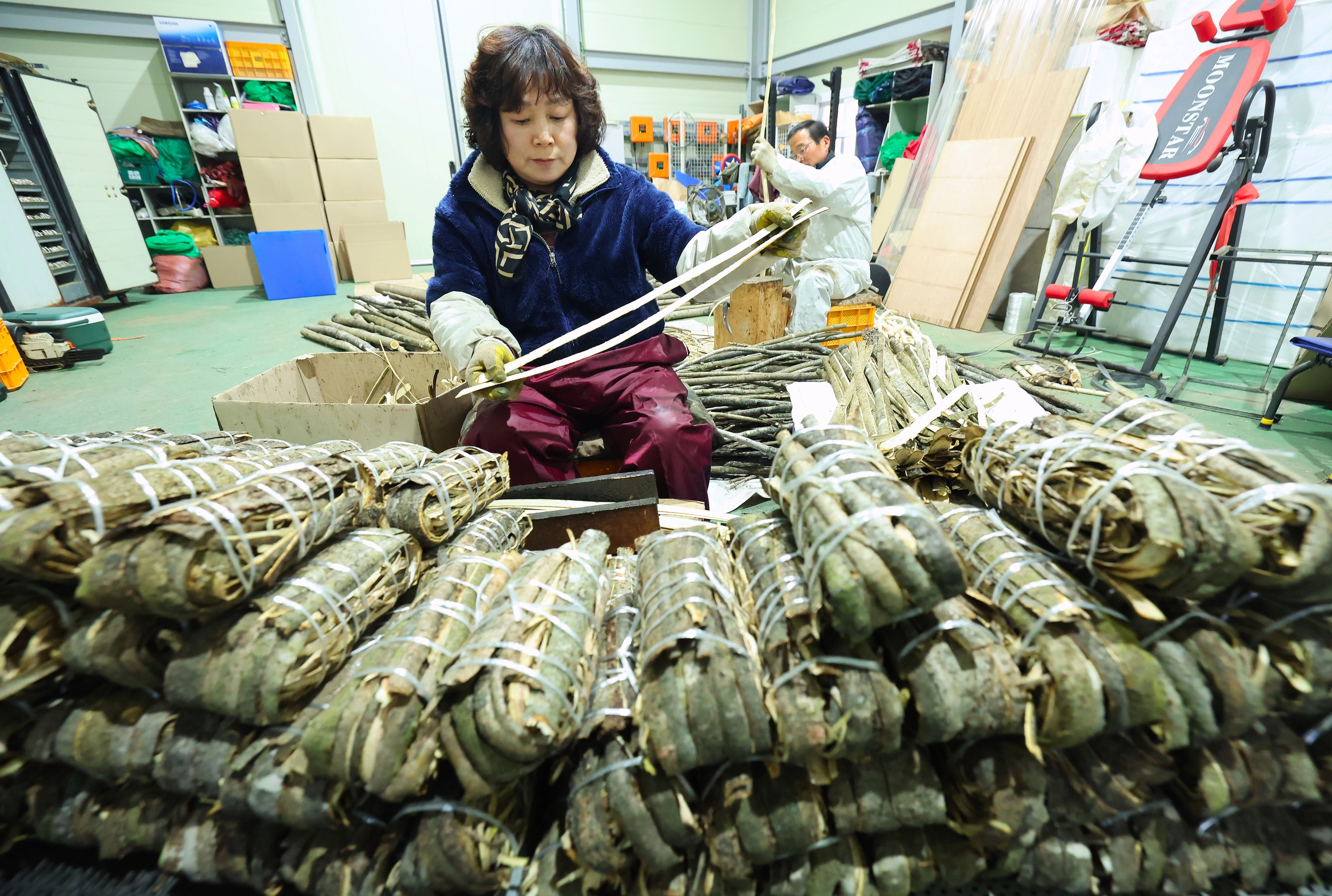 8일 경남 함양군 마천면 의탄리 의중마을에서 주민들이 천연 항노화 식품으로 알려진 토종 참옻나무 껍질을 벗기는 작업을 하고 있다.