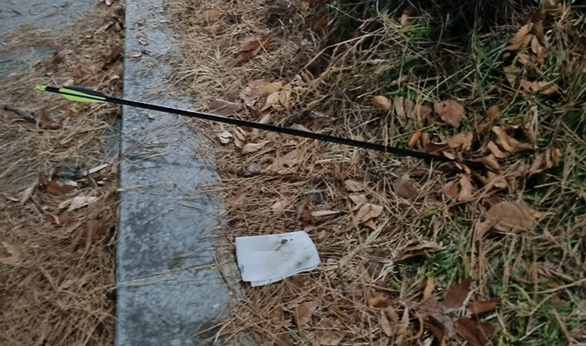 화살은 강아지로부터 1.5m, B씨로부터 2.5m 거리의 광장 화단에 꽂혔다. 화살 길이는 80㎝며, 촉은 금속 재질이다.