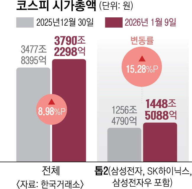 하지만 개인 투자자 체감은 엇갈린다. 상승의 열매가 반도체 대형주에 집중되고 있어서다. 실제 올해 들어 코스피 시가총액이 8.98% 늘어나는 동안 삼성전자(삼성전자우 포함), SK하이닉스 등 양대 반도체주 시가총액은 15.28% 증가했다. 반면 이들 두 종목을 제외한 950여개 종목 시가총액은 같은 기간 5.74% 늘었다. 시장 전체가 오르는 듯 보이지만, 실상 ‘두 개의 엔진’만 전속력으로 달리는 구조다.