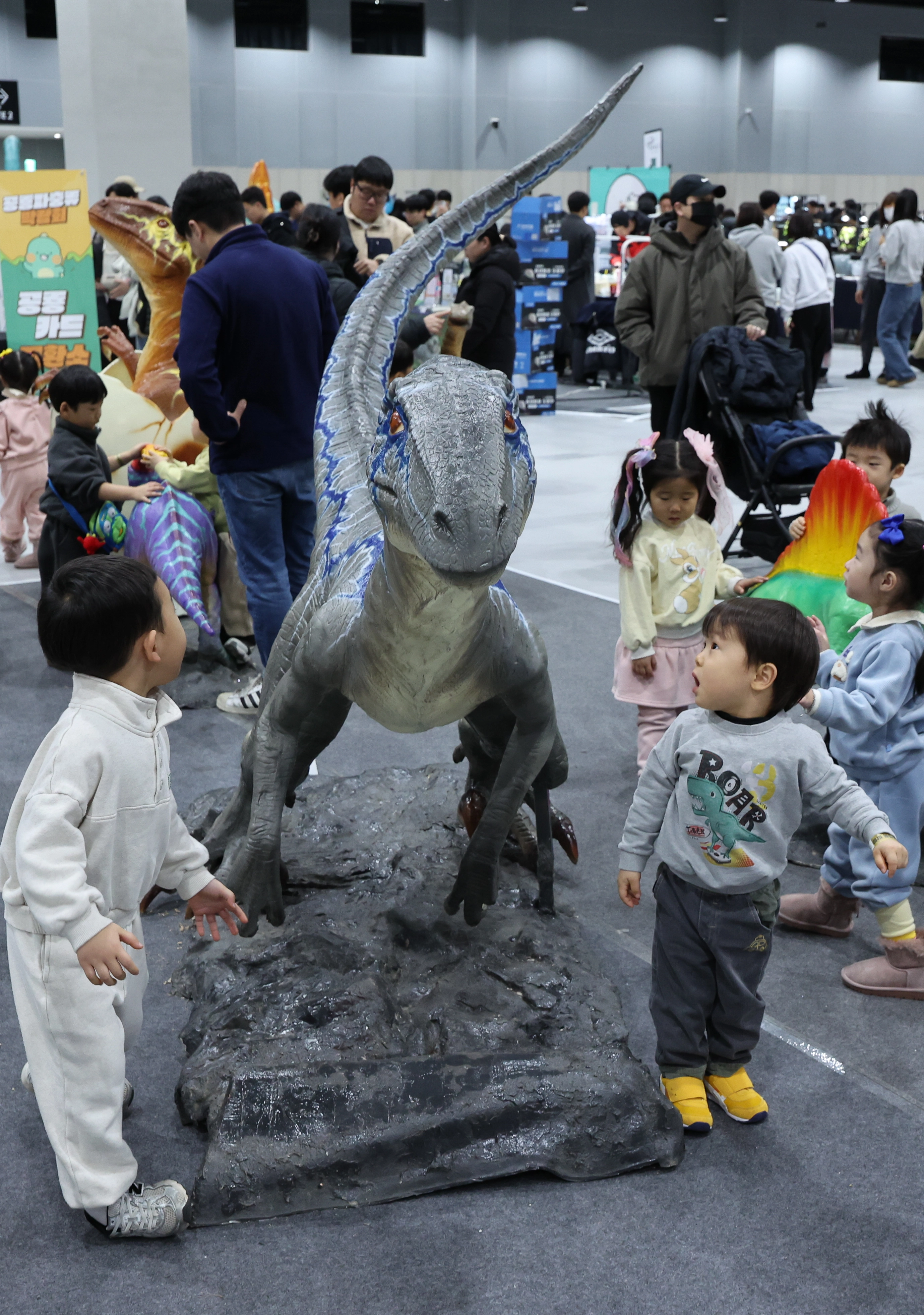 11일 서울 강서구 코엑스 마곡에서 열린 공룡 파충류 박람회에서 어린이들이 공룡 모형을 보고 깜짝 놀란 듯한 표정을 짓고 있다. 공룡 파충류 박람회는 공룡 모형들과 실제 희귀 파충류를 전시 및 판매하는 국내 최대 규모의 파충류 상업 박람회다.