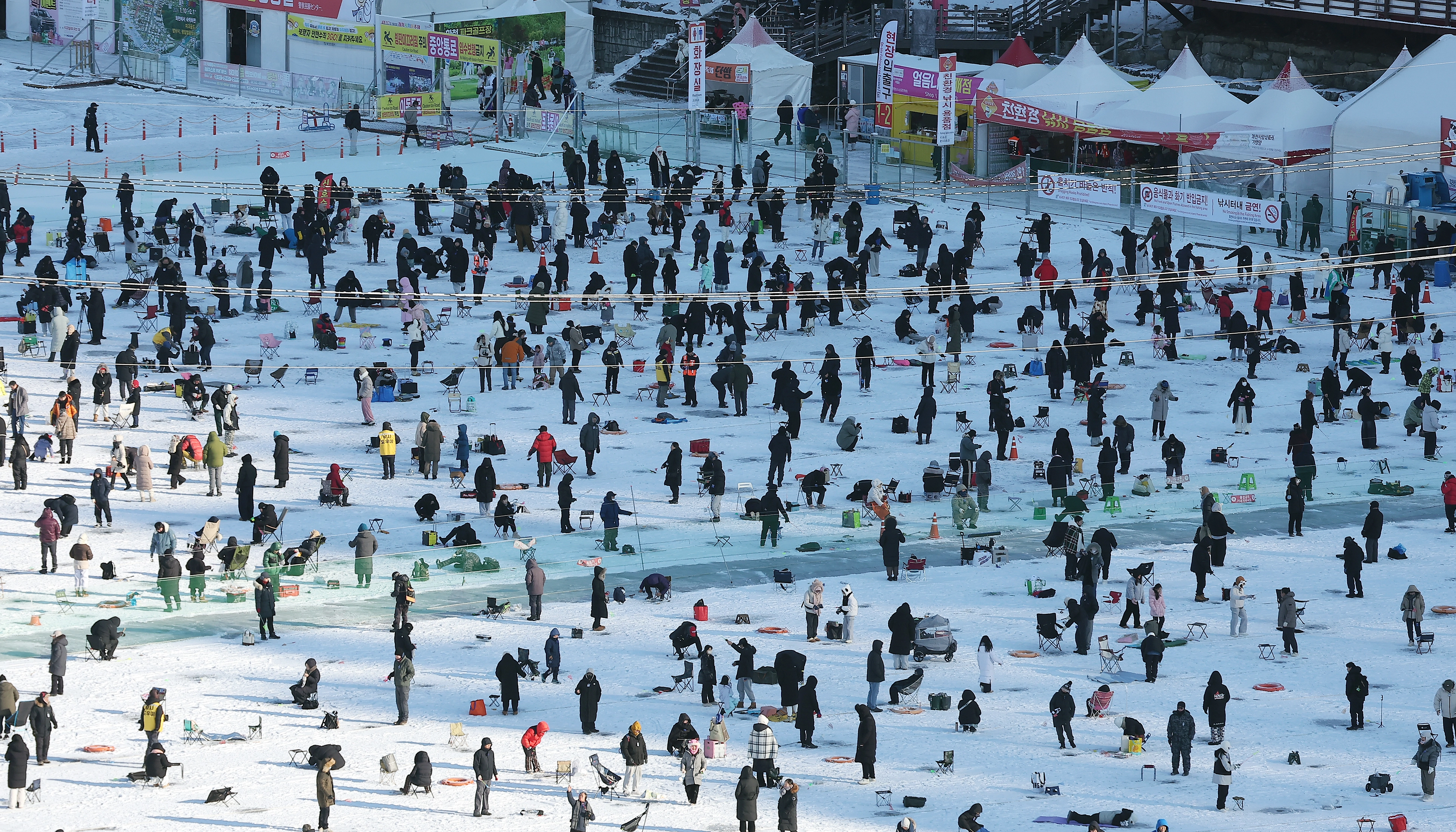 11일 강원 화천군 화천읍에서 열린 2026 화천산천어축제를 찾은 관광객들이 얼음낚시를 즐기고 있다. 전날 화천산천어축제장에서 개막한 축제는 다음 달 1일까지 23일간 열린다. 화천 뉴스1