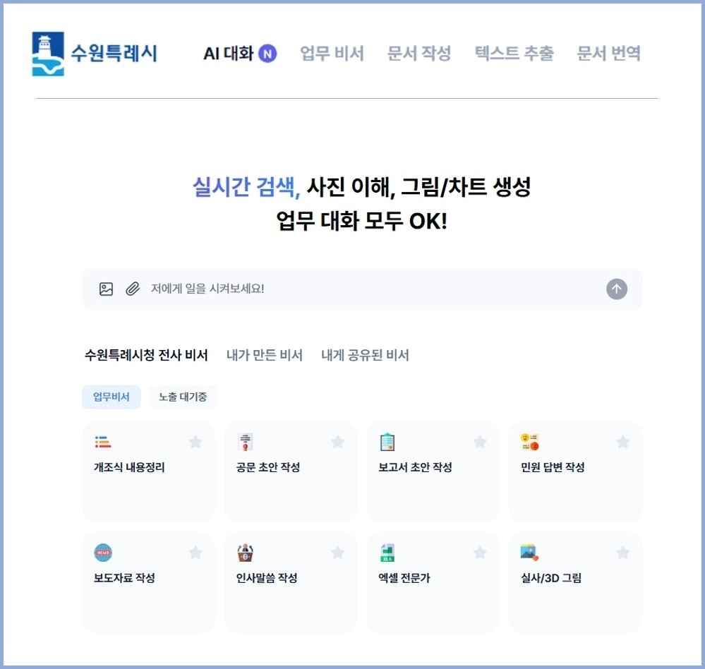 수원특례시가 12일 공직자를 대상으로 ‘수원 인공지능(AI) 업무 비서’ 서비스를 시작했다. 이 서비스는 챗지피티(ChatGPT), 제미나이(Gemini), 퍼플렉시티(Perplexity), 클로드(Claude) 등 다양한 생성형 인공지능(AI) 모델을 하나의 플랫폼에서 활용할 수 있는 인공지능 업무지원 서비스다. 업무 비서는 문서 작성, 민원 답변 초안 작성, 번역 등 문서 기반 행정 업무와 함께 보도자료, 블로그 등 홍보 콘텐츠 제작도 지원한다.