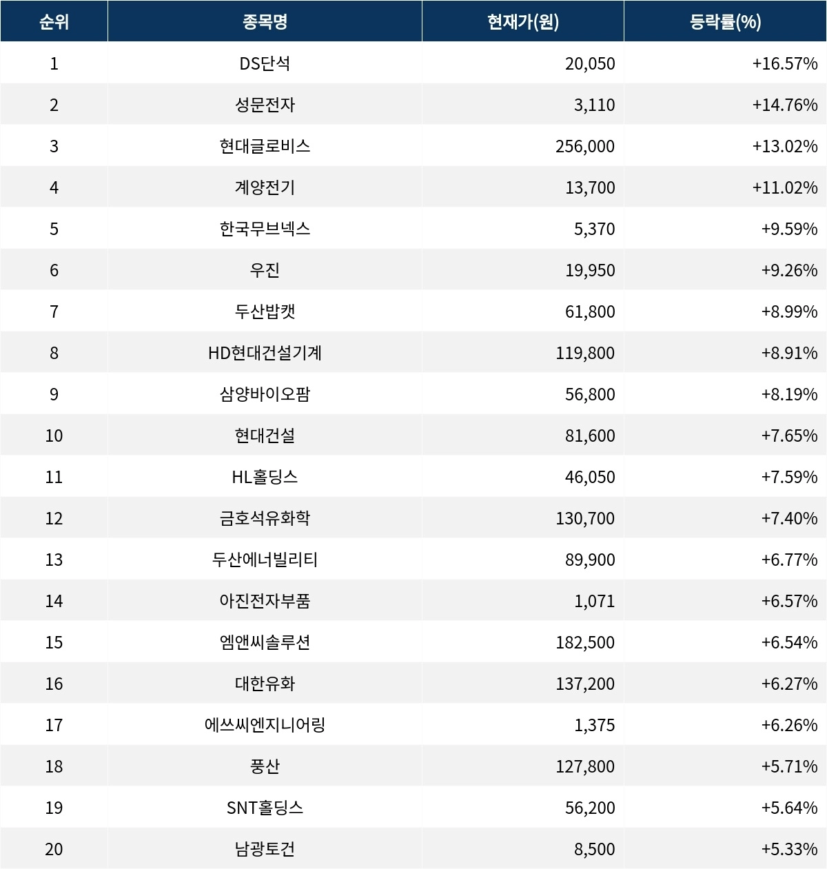이밖에도 HL홀딩스(060980) ▲7.59%, 금호석유화학(011780) ▲7.40%, 두산에너빌리티(034020) ▲6.77%, 아진전자부품(009320) ▲6.57% 등을 기록하며 시장에서 활발히 거래되고 있다.