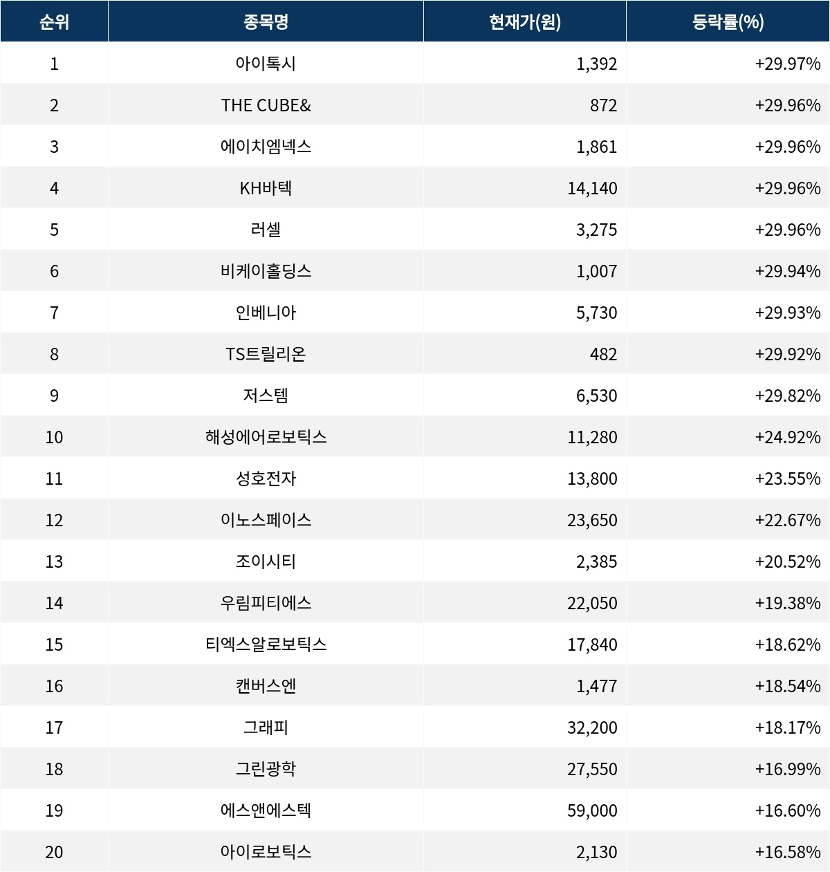 6위 비케이홀딩스(050090)는 1,007원으로 +29.94% 상승 마감했다. 7위 인베니아(079950)는 종가 5,730원으로 +29.93% 상승 마감했다. 8위 TS트릴리온(317240)은 종가 482원으로 +29.92% 상승 마감했다. 9위 저스템(417840)은 6,530원으로 +29.82% 상승 마감했다. 10위 해성에어로보틱스(059270)는 11,280원으로 +24.92% 상승 마감했다.