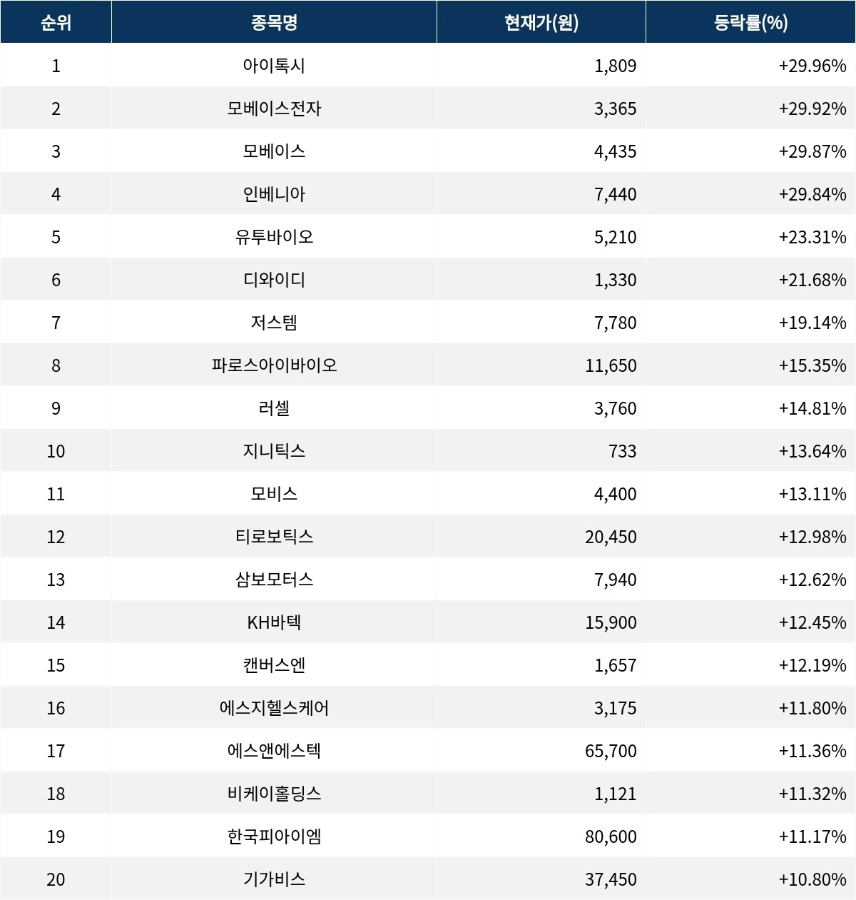 이어 상승률 2위 모베이스전자(012860)는 현재가 3365원으로 주가가 29.92% 상한가를 기록하고 있다. 상승률 3위 모베이스(101330)는 현재 4435원으로 29.87%상한가를 기록하고 있다. 상승률 4위 인베니아(079950)는 29.84% 상승하며 7440원에 거래되고 있다. 상승률 5위 유투바이오(221800)는 23.31%의 상승세를 타고 5210원에 거래되고 있다.