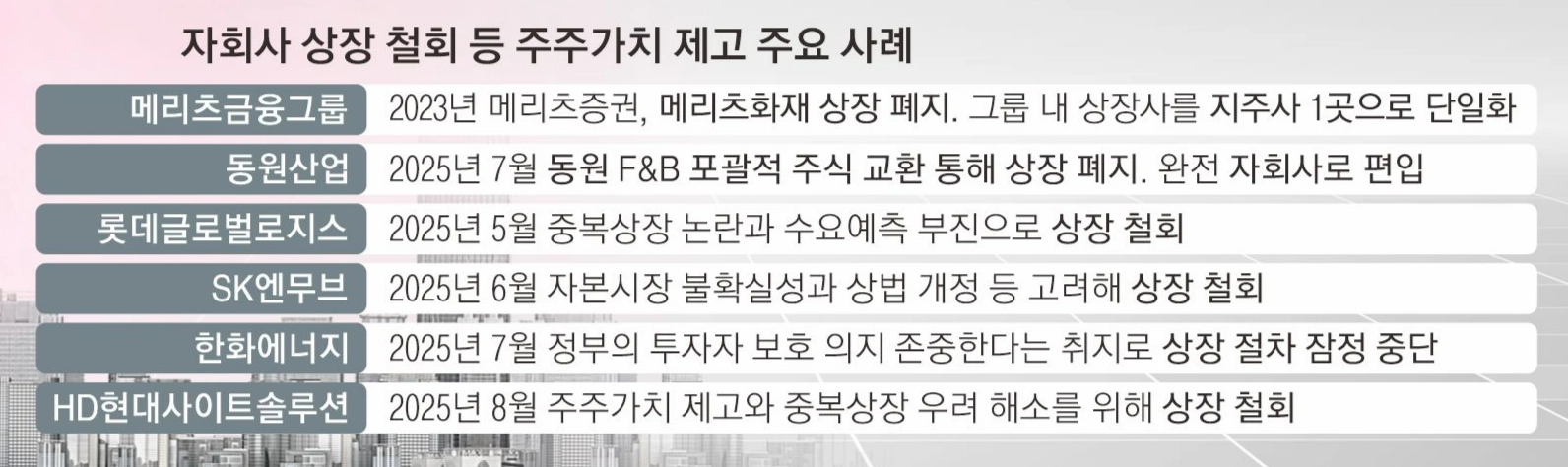 중복상장 추진 시 모회사 주주총회에서 소액주주 동의를 받도록 하는 방안도 거론된다. 대주주와 경영진의 인식 전환도 필요하다는 지적이다. 이런 문제 제기가 이어지면서, 지난해 7월 이사의 충실 의무를 주주까지 확대한 상법 개정 이후 한화에너지와 SK엔무브 등 일부 기업은 상장 계획을 철회하거나 잠정 중단했다.