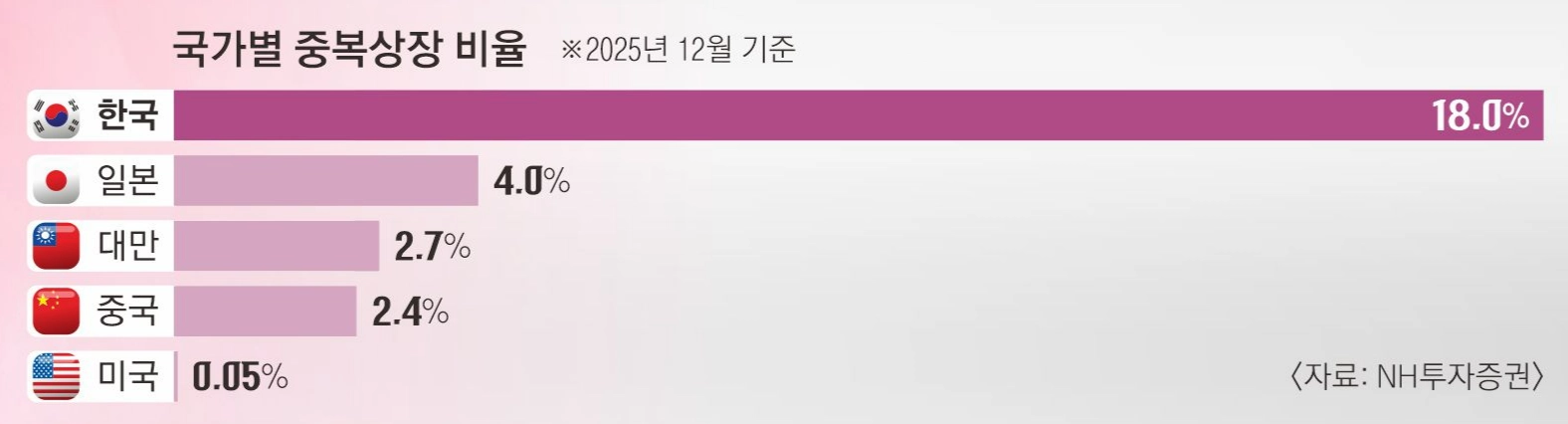 국내 중복상장 비중은 주요국과 비교해 압도적으로 높다. 13일 NH투자증권에 따르면 지난해 12월 기준 국내 증시 시가총액 중 중복상장 기업이 차지하는 비율은 18.0%에 달한다. 일본(4.0%), 미국(0.05%)은 물론 대만(2.7%), 중국(2.4%)보다도 월등히 높다.