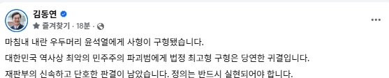 김동연 지사 “윤석열 사형 구형, 당연한 귀결!…정의 실현돼야”