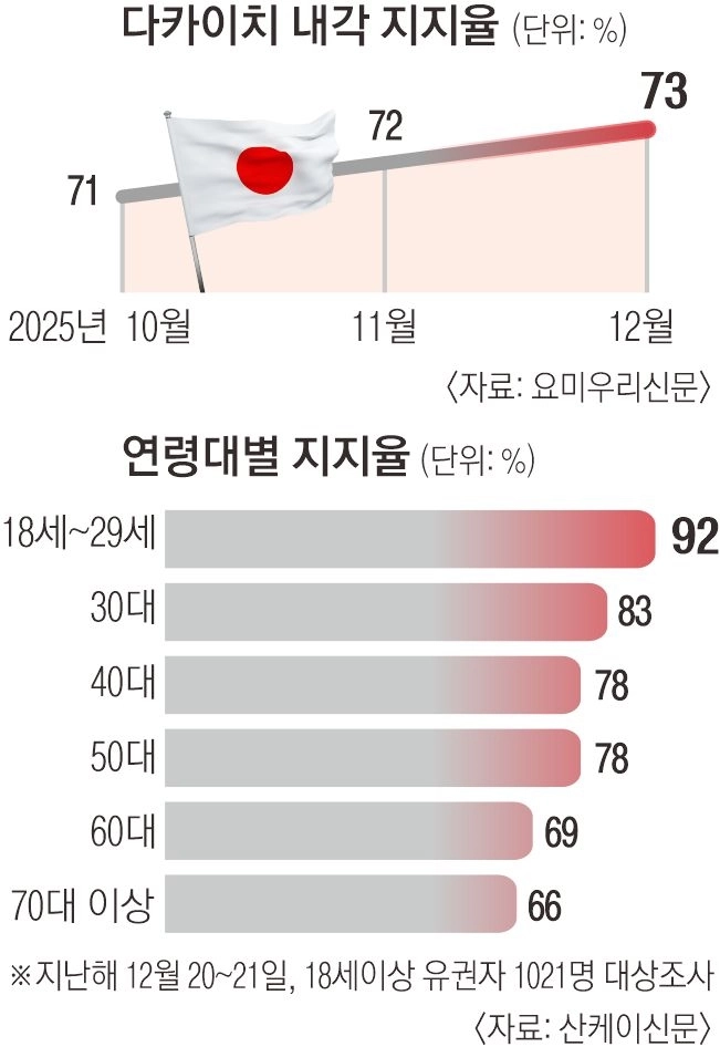 요미우리신문이 지난달 22일 공개한 전국 여론조사(19∼21일 실시)에 따르면 다카이치 사나에 정부 지지율은 73%로 집계됐다. 내각 출범 이후 두 달 넘게 70%대를 유지하고 있다. 내각 출범 직후부터 이 같은 지지율을 이어간 사례는 호소카와 모리히로(1993년), 고이즈미 준이치로(2001년) 내각 이후 처음이다.