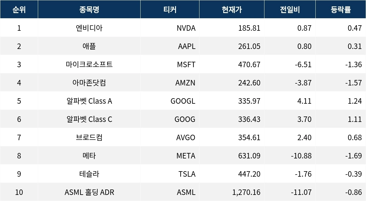 아마존닷컴은 1.57% 하락하며 242.60달러를 기록했다. 알파벳 Class A(GOOGL)는 1.24% 상승한 335.97달러에 거래됐다. 알파벳 Class C(GOOG)도 1.11% 올라 336.43달러를 기록했다. 브로드컴(AVGO)은 0.68% 상승해 354.61달러로 마감했다.