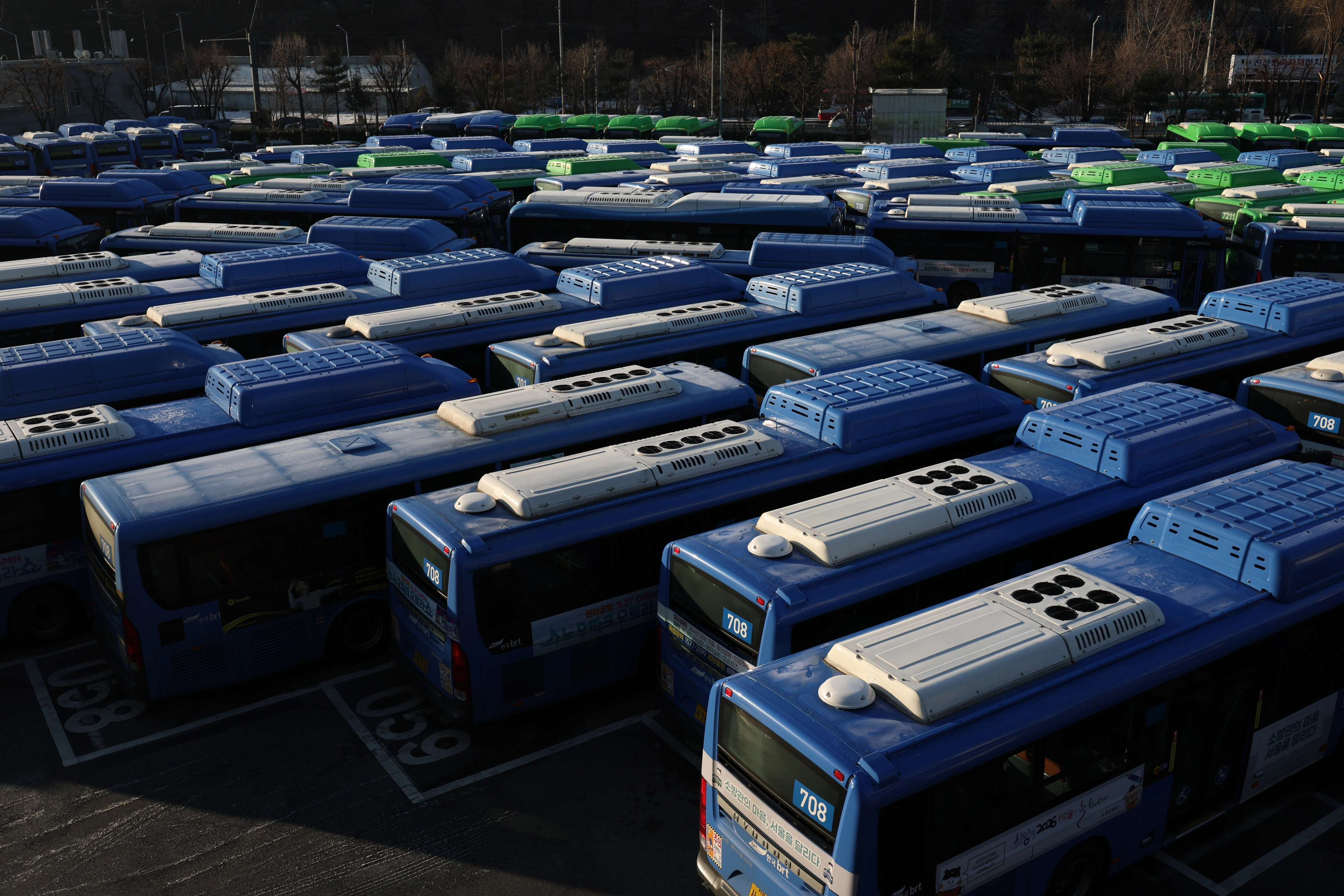 서울 시내버스 노동조합이 무기한 전면파업에 돌입한 13일 서울 한 버스공영차고지에 서울 시내 버스들이 주차돼 있다. 2026.1.13 연합뉴스