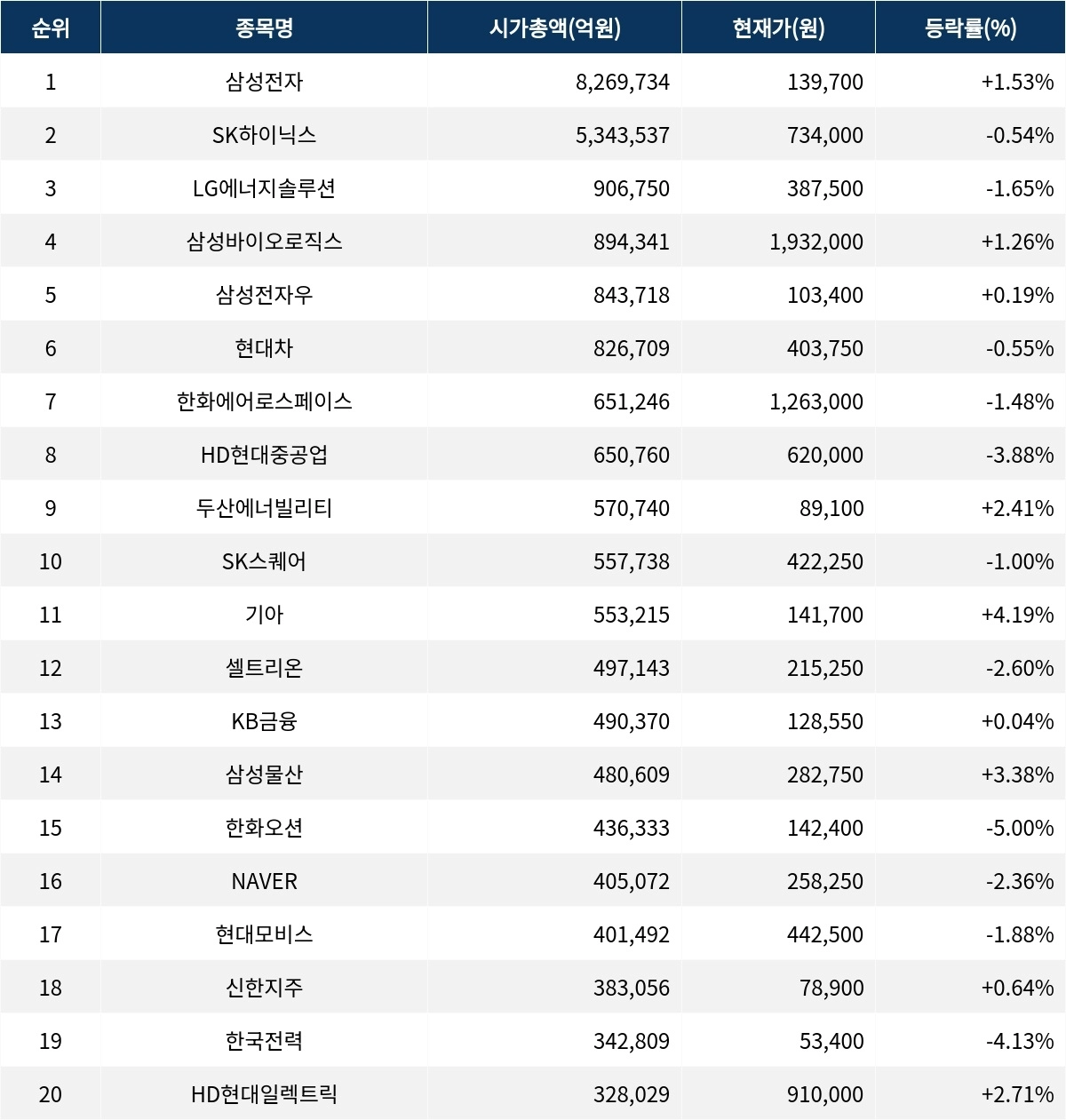 LG에너지솔루션(373220) ▼1.65%, 삼성바이오로직스(207940) +1.26%, 삼성전자우(005935) +0.19%, 현대차(005380) ▼0.55%, 한화에어로스페이스(012450) ▼1.48%, HD현대중공업(329180) ▼3.88%, 두산에너빌리티(034020) +2.41%, SK스퀘어(402340) ▼1.00%
