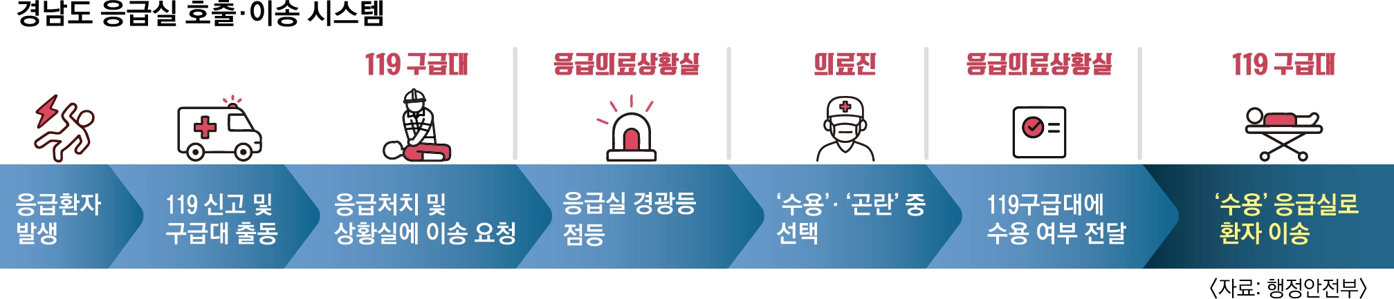 #. 지난해 6월의 어느 날 경남 창원 의창구 한 아파트에서 40대 남성 A씨가 갑자기 경련을 일으켰다. 출동한 119구급대는 ‘경남 응급의료상황실’에 연락해 “당장 응급실로 옮겨야 한다”고 요청했다. 상황실은 인근 병원 응급실 의료진을 호출했고, 의료진은 ‘구급 스마트 시스템’에 접속해 환자 맥박을 비롯한 활력 징후를 확인한 뒤 ‘환자 수용’ 버튼을 눌렀다. 소방과 행정, 병원의 ‘3박자 협업’으로 환자는 신속하게 응급실에 도착해 치료받았고 생명을 건질 수 있었다.