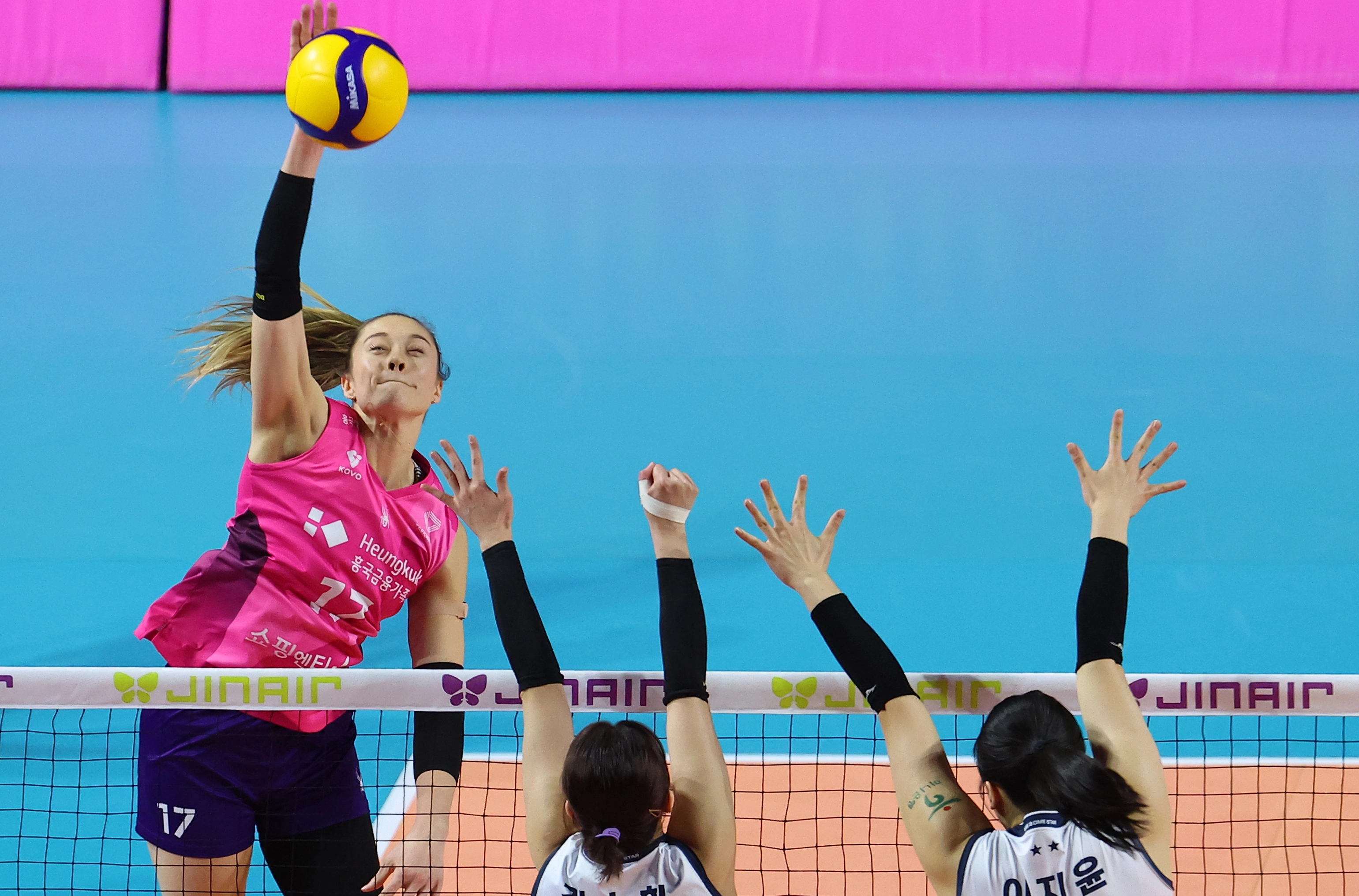 프로배구 V리그 여자부 3위 흥국생명이 1위 한국도로공사와의 맞대결에서 승리하며 2위 현대건설과 승점 동점을 이뤘다. 흥국생명은 14일 인천 삼산월드체육관에서 열린 2025~26 V리그 여자부 홈경기에서 도로공사에 세트 점수 3-1(23-25 25-22 29-27 25-16)로 역전승했다.