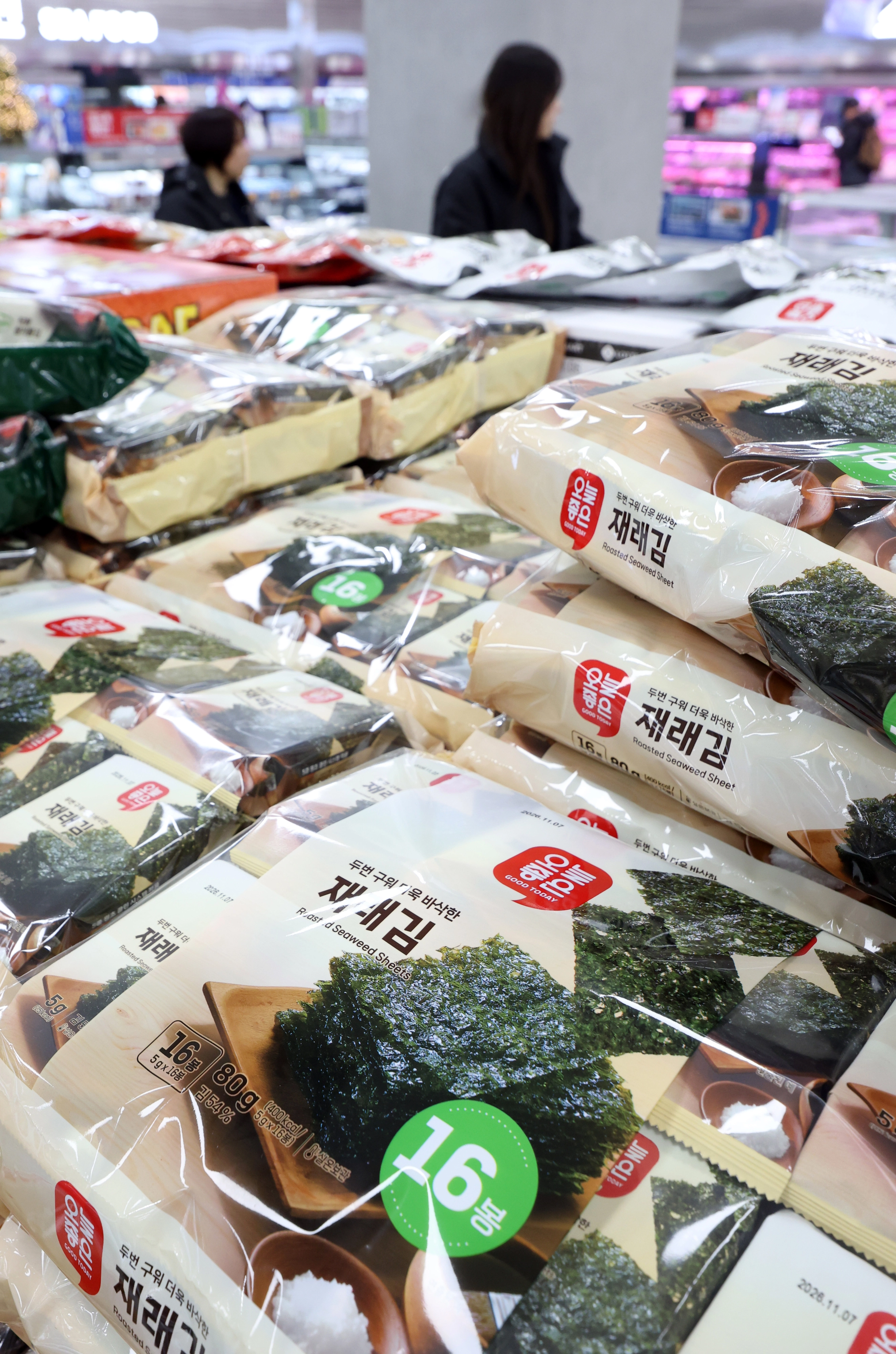 해양수산부는 지난해 수산식품 수출액이 33억 3000만 달러(약 4조 9000억원)로 역대 최대를 기록했고, 이 중에 김이 수출 1위 품목이었다고 15일 밝혔다. 사진은 이날 서울 시내 한 대형마트에 진열된 조미김 상품.