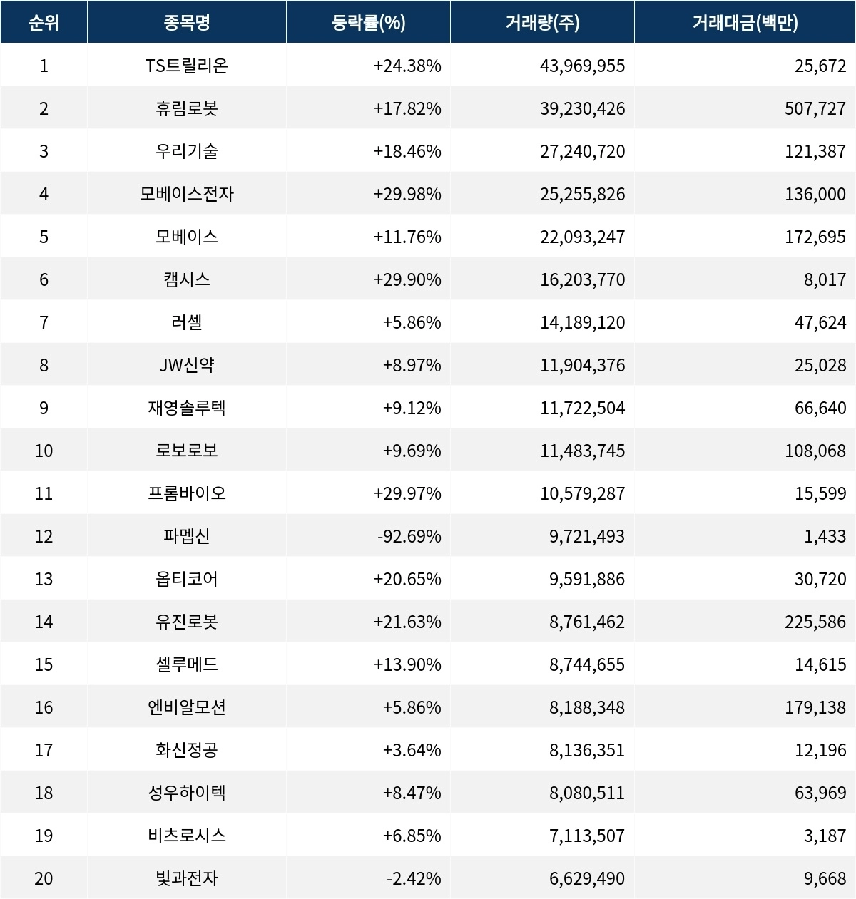 우리기술(032820)은 2724만 720주가 거래되어 거래량 3위에 올랐다. 현재가는 4780원이며, 등락률은 18.46%로 기록된다. 모베이스전자(012860)는 2525만 5826주가 거래되었고, 주가는 5680원으로 29.98% 상승했다. 모베이스(101330)는 2209만 3247주의 거래량과 함께 11.76% 상승하여 8360원에 거래되고 있다. 캠시스(050110)는 1620만 3770주가 거래되며 상한가에 도달했다. 러셀(217500)은 1418만 9120주가 거래되며 5.86% 상승하고 있으며, JW신약(067290)은 1190만 4376주가 거래되어 8.97% 오른다. 재영솔루텍(049630)은 1172만 2504주가 거래되며 9.12% 상승, 로보로보(215100)는 1148만 3745주가 거래되며 9.69% 상승하고 있다.