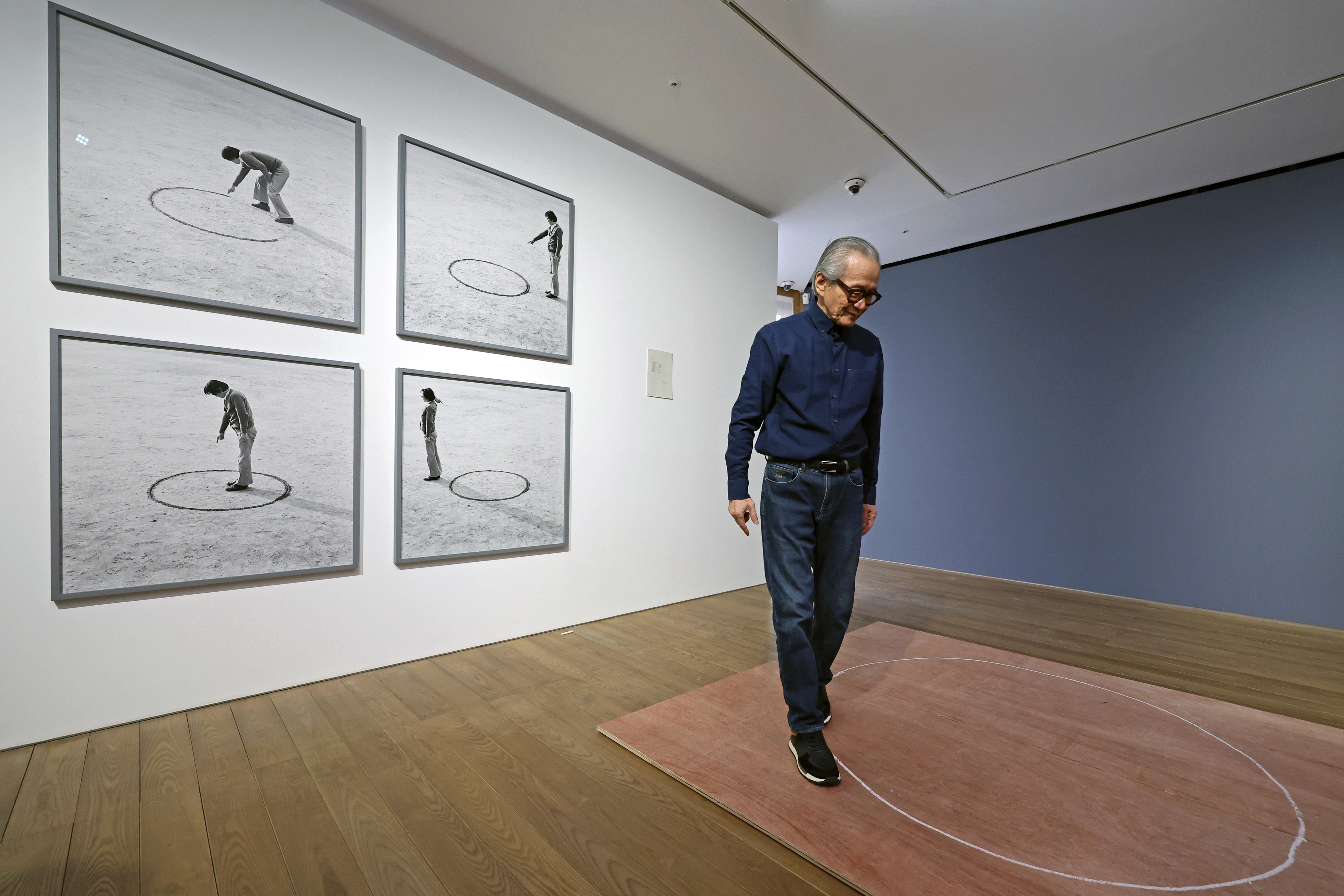 지난 4일 전시장을 찾은 작가는 1975년 홍익대 운동장에서 선보였던 퍼포먼스 ‘장소의 논리’를 재연했다. 작가는 분필을 들고 진중한 표정으로 가로, 세로 2m 크기의 널빤지 위에 섰다. 이어 몸을 컴퍼스 삼아 큰 원을 그려냈다. 원 밖으로 나온 작가는 원 안을 가리키며 “저기, 저기, 저기”라고 외쳤다. 이어 원 안으로 들어가더니 아까와 같은 장소를 가리키며 “여기, 여기, 여기”라 했다. 원을 등진 채 빠져나온 뒤에는 어깨 너머에 있는 또 같은 지점을 가리키며 “거기, 거기, 거기”라고 말했다. 이후 원을 따라 밟으며 “어디, 어디, 어디”라 했다.