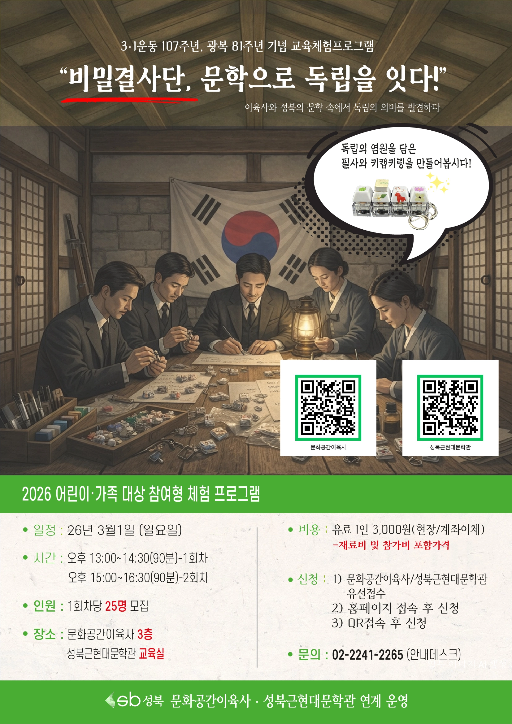 이승로 성북구청장은 “3·1절을 맞아 독립의 의미를 문학과 연결해 가족이 함께 체험할 수 있도록 기획했다”며 “지역 문화공간이 생활 속 역사교육의 장이 되도록 연계 프로그램을 이어갈 계획이다”고 밝혔다.
