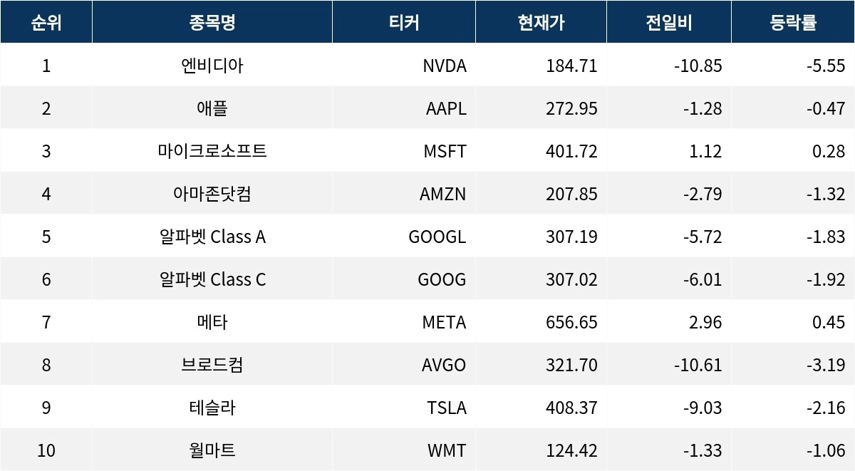 엔비디아는 5.55% 하락하며 184.71달러에 거래를 마감했다. 이는 빅테크 종목 중 가장 큰 하락폭이다. 애플은 0.47% 하락해 272.95달러에 거래됐으며, 마이크로소프트(MSFT)는 0.28% 상승해 401.72달러를 기록했다.