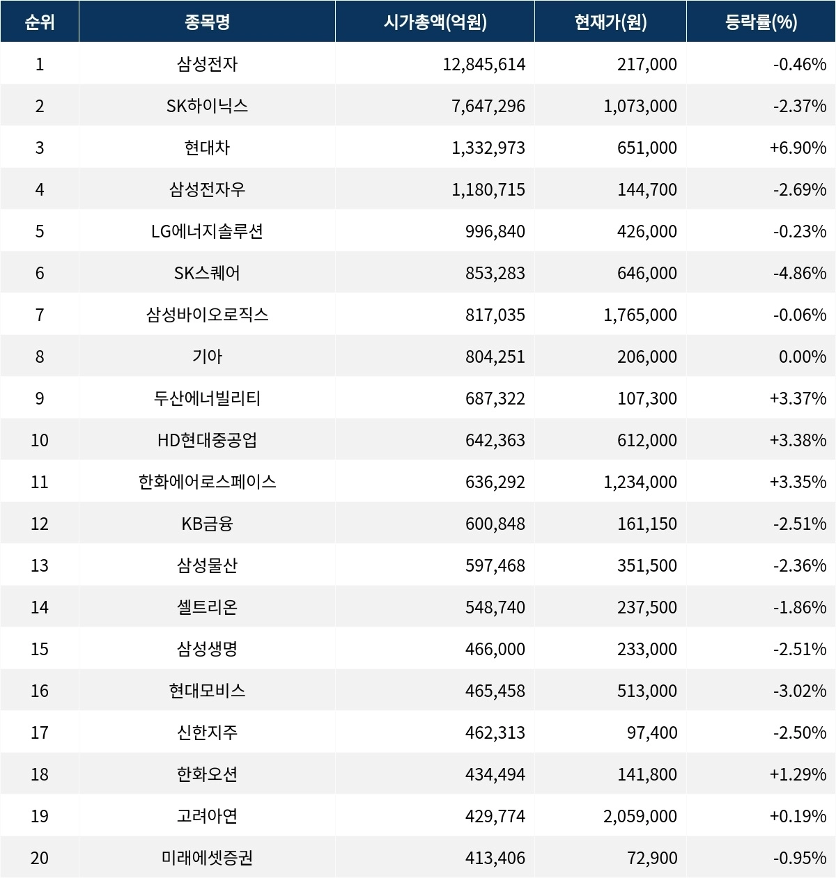 27일 오후 12시 20분 한국거래소에 따르면, 시가총액 1위인 삼성전자(005930)는 현재가 21만 7000원으로 전 거래일 대비 0.46% 하락하고 있다. 시가총액은 128조 4561억원이며, 외국인비율은 50.66%에 달한다. SK하이닉스(000660)는 107만 3000원으로 2.37% 하락하며, 거래량은 332만 5004주에 이른다. 시가총액은 76조 4729억원이다.