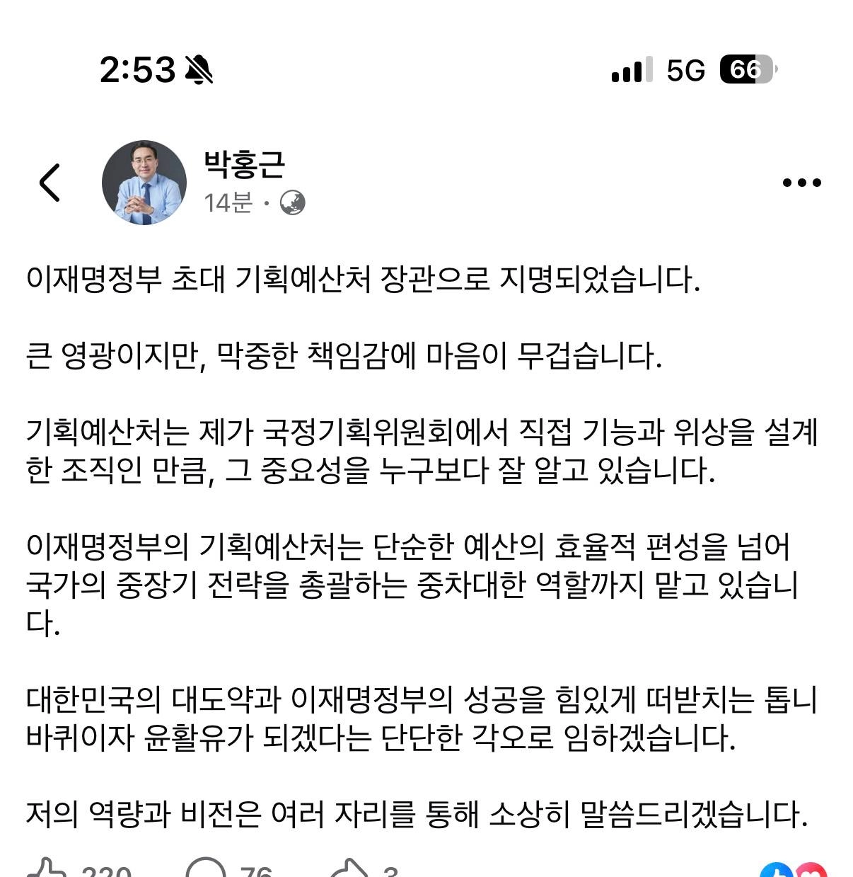 박홍근 기획예산처 장관 후보자는 2일 “이재명 정부 초대 기획예산처 장관으로 지명됐다. 큰 영광이지만 막중한 책임감에 마음이 무겁다”고 소감을 밝혔다.