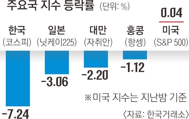 일본 닛케이225 지수와 홍콩 항셍지수는 이날 각각 3.06%, 1.12% 하락했다. 간밤 미국 증시에서 스탠더드앤드푸어스(S&P) 500 지수는 0.04% 올랐다. 대형 기술주와 에너지주 상승이 장 초반 낙폭을 만회한 영향이다.