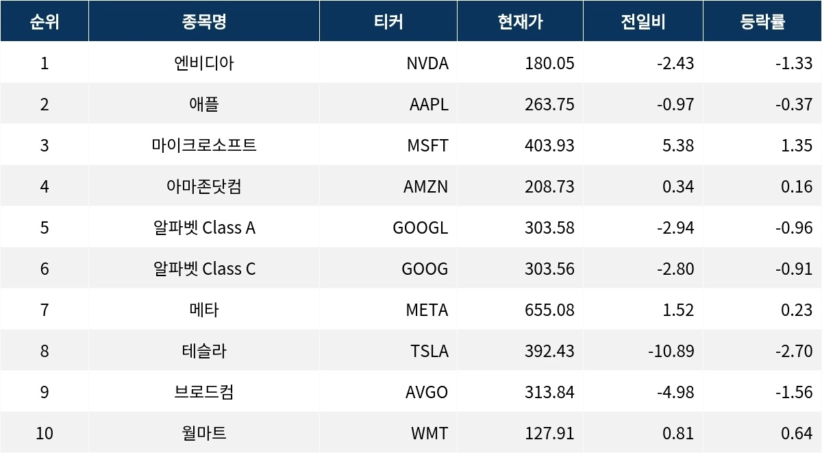 애플(AAPL)은 263.75 달러로 0.37% 하락하며 보합세를 보였다. 아마존닷컴(AMZN)은 208.73 달러로 0.16% 상승했다. 알파벳 Class A(GOOGL)는 303.58 달러로 0.96% 하락하였고, 알파벳 Class C(GOOG)는 303.56 달러로 0.91% 하락했다.