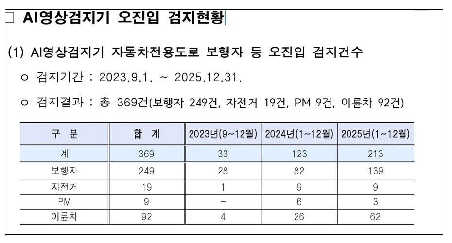 국민의힘 이경숙 서울시의원이 서울시설공단으로부터 제출받은 자료에 따르면, AI 영상검지기에 포착된 자동차전용도로 오진입 건수는 2024년 123건에서 2025년 213건으로 1년 새 73% 증가한 것으로 나타났다.