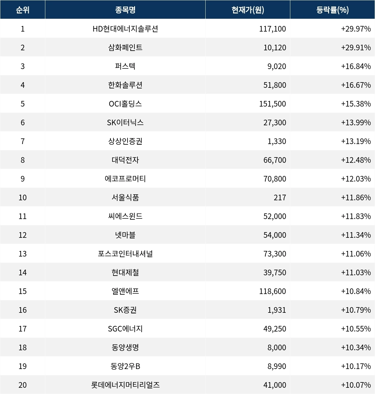 6위 SK이터닉스(475150)는 2만 7300원으로 13.99% 상승 마감했다. 7위 상상인증권(001290)은 종가 1330원으로 13.19% 올랐다. 8위 대덕전자(353200)는 종가 6만 6700원으로 12.48% 상승 마감했다. 9위 에코프로머티(450080)는 7만 800원으로 12.03% 상승 마감했다. 10위 서울식품(004410)은 217원으로 11.86% 상승하며 장을 마쳤다.