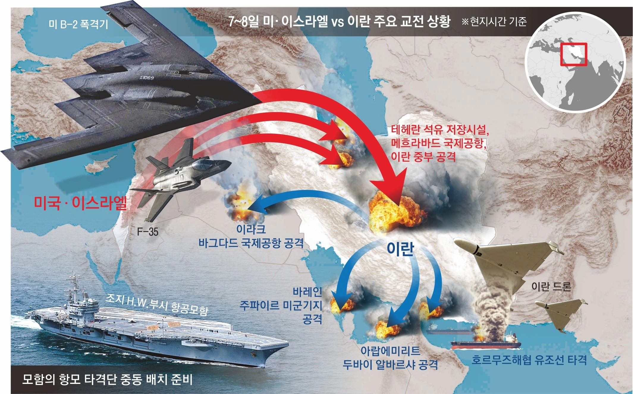 공습 1주 차에 이란 영공을 장악한 미국과 이스라엘은 공격 대상을 이란 무기 생산 시설과 에너지 인프라로 넓히며 압박 수위를 높이고 있다. 7일(현지시간) 외신을 종합하면 이번 전쟁은 이날 현재 이란 수도 테헤란, 레바논 수도 베이루트, 호르무즈 해협 등 3대 전선으로 확대됐다.