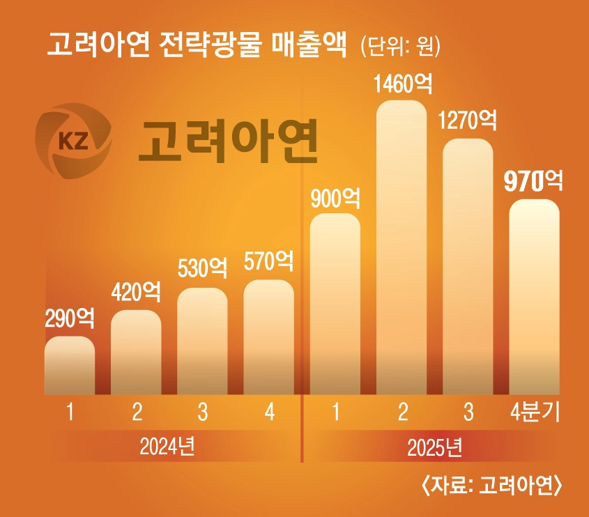 중국이 2024년 전략광물 수출 통제를 본격화하자 고려아연이 대체 공급망으로 급부상했다. 세계 전략광물 생산량의 70%를 차지하는 중국을 제외하면, 전략 광물 제련 기술을 보유한 유일한 기업이다. 고려아연은 아연·연·인듐·안티모니등 10여종의 비철금속을 연간 100만t 이상 생산한다. 고려아연의 전략광물 매출은 2024년 1810억원에서 지난해 4600억원으로 2.5배로 뛰었다.