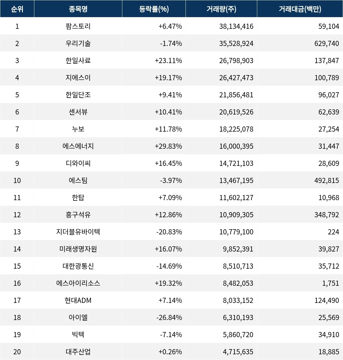 한편 거래량 상위 20위권 종목들은 한탑(002680) ▲17.6%, 흥구석유(024060) ▲12.9%, 지더블유바이텍(036180) ▼95.3%, 미래생명자원(218150) ▲16.1%, 대한광통신(010170) ▼14.7%, 에스아이리소스(065420) ▲19.3%, 현대ADM(187660) ▲7.1%, 아이엘(307180) ▼26.8%, 빅텍(065450) ▼7.1%, 대주산업(003310) ▲0.3% 등의 성적을 기록했다.