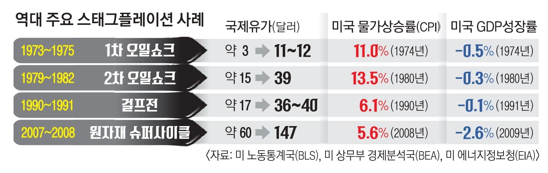 대표적인 사례가 1970년대 오일쇼크다. 중동전쟁 이후 산유국 감산으로 국제 유가는 약 3달러에서 11~12달러로 약 4배 급등했다. 이에 따라 1974년 미 소비자물가 상승률은 11.0%까지 치솟았고 같은 해 미 경제성장률은 -0.5%를 기록했다. 1979년 이란 혁명 이후 발생한 2차 오일쇼크 때도 국제 유가는 약 15달러에서 39달러까지 상승했고 미 물가 상승률은 1980년 13.5%까지 올라갔다. 같은 해 경제성장률은 -0.3%로 떨어지며 고물가와 경기 둔화가 동시에 나타났다.