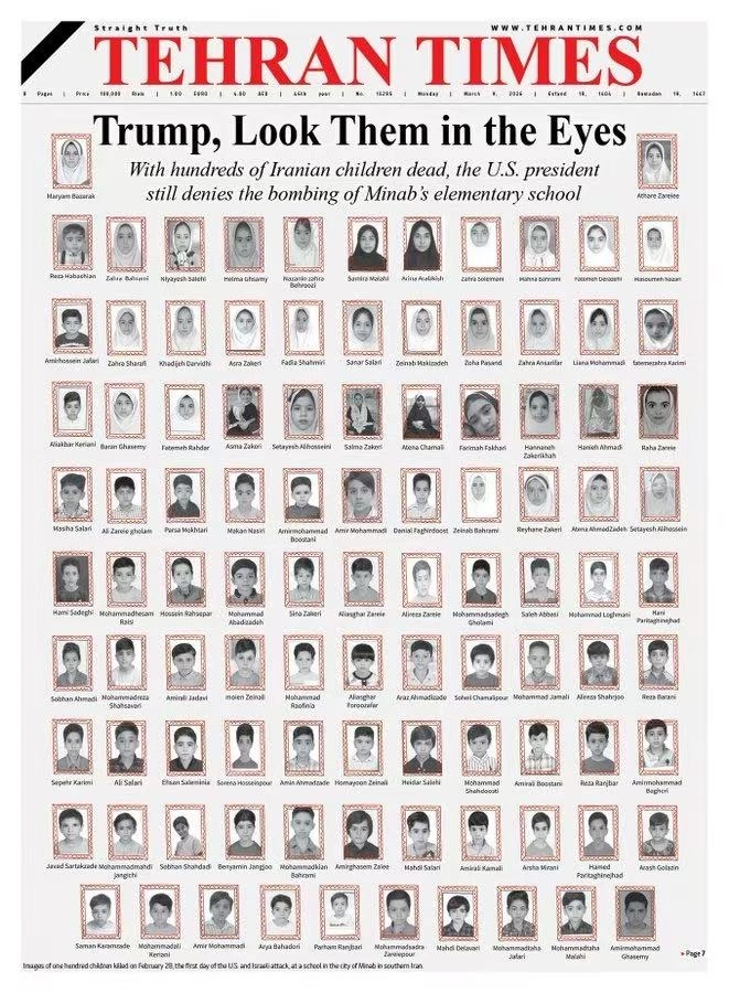 신문은 “수백명의 이란 어린이가 숨졌지만 미국 대통령은 여전히 미나브 초등학교 폭격을 부인하고 있다”는 문구를 게재하며 트럼프 대통령의 책임을 주장했다.