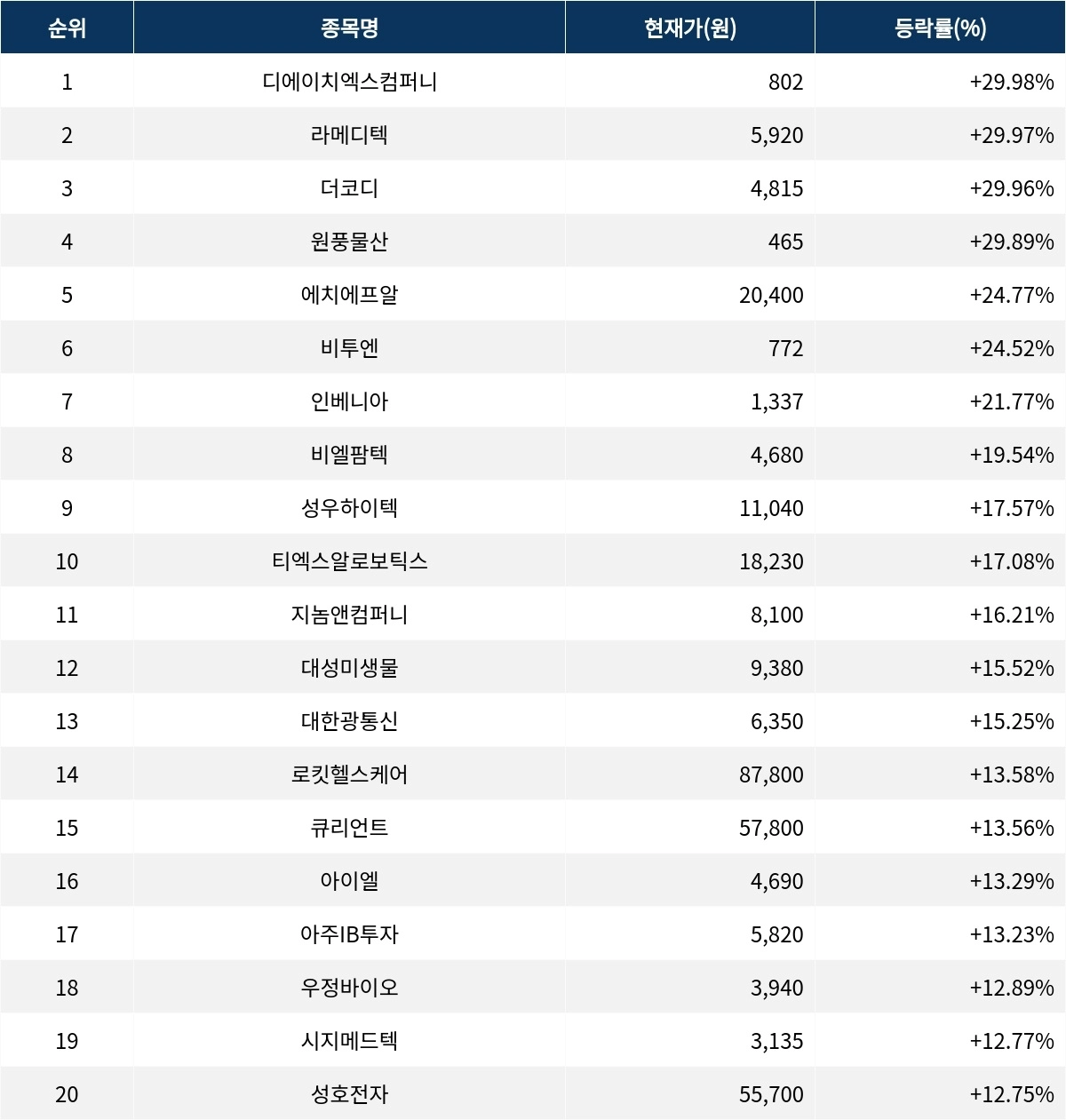 이어 상승률 2위 라메디텍(462510)은 현재가 5920원으로 주가가 29.97% 상한가를 기록 중이다. 상승률 3위 더코디(224060)는 현재 4815원으로 29.96% 상한가를 기록하며 강세를 보이고 있다. 상승률 4위 원풍물산(008290)은 29.89% 상승하며 465원에 거래되고 있다. 상승률 5위 에치에프알(230240)은 24.77%의 상승세를 타고 2만 400원에 거래되고 있다.