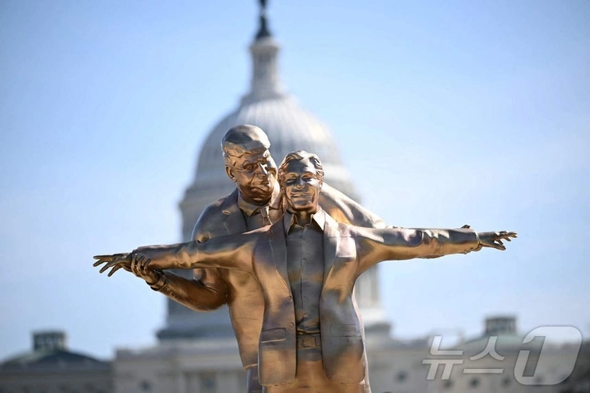 금색 스프레이 페인트로 칠해진 3.6m 높이의 동상은 트럼프 대통령과 엡스타인이 마치 비극적인 최후를 맞은 영화 ‘타이타닉’의 주인공 잭과 로즈처럼 배의 뱃머리에 서서 워싱턴 기념탑을 바라보는 모습이다.
