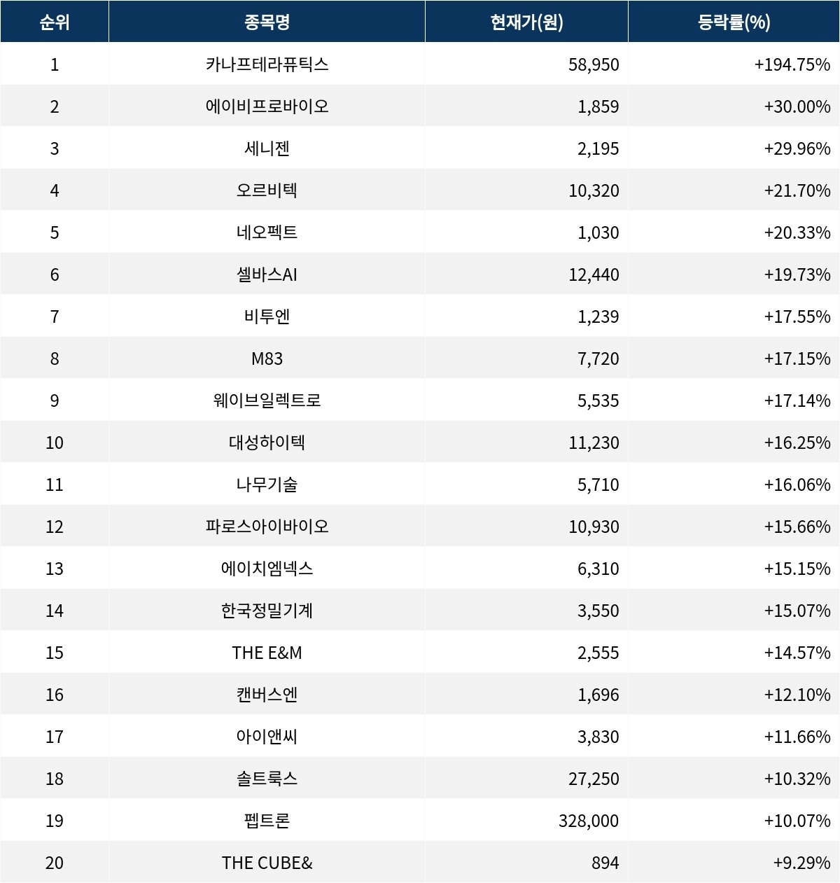 6위 셀바스AI(108860)는 현재가 1만 2440원으로 19.73% 상승 중이다. 7위 비투엔(307870)은 현재가 1239원으로 17.55% 상승 중이다. 8위 M83(476080)은 현재가 7720원으로 17.15% 상승 중이다. 9위 웨이브일렉트로(095270)는 현재가 5535원으로 17.14% 상승 중이다. 10위 대성하이텍(129920)은 현재가 1만 1230원으로 16.25% 상승 중이다.