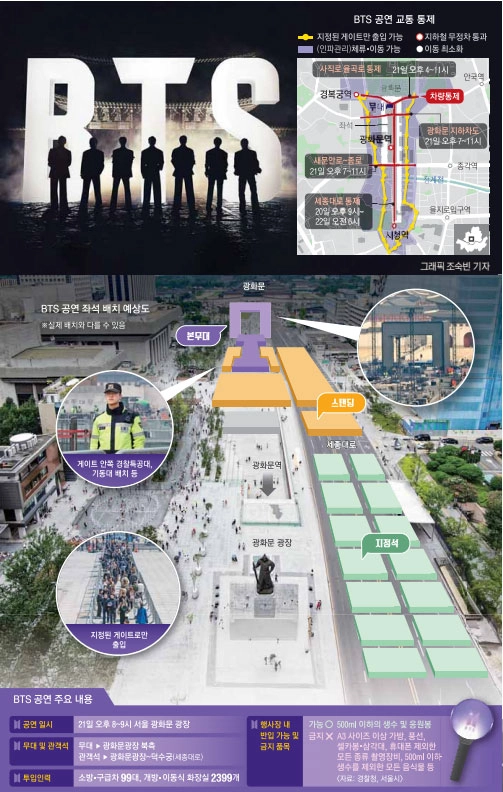 차량 통제도 이뤄진다. 객석이 설치되는 광화문광장부터 서울광장까지는 공연 전날인 20일 오후 9시부터 공연 다음 날인 22일 오전 6시까지 통제된다. 사직로(정부서울청사 교차로~경복궁 사거리)는 21일 오후 4~11시까지, 새문안로(새문안로 교차로~종로1가 사거리)와 광화문 지하차도는 21일 오후 7시부터 11시까지 통제한다.