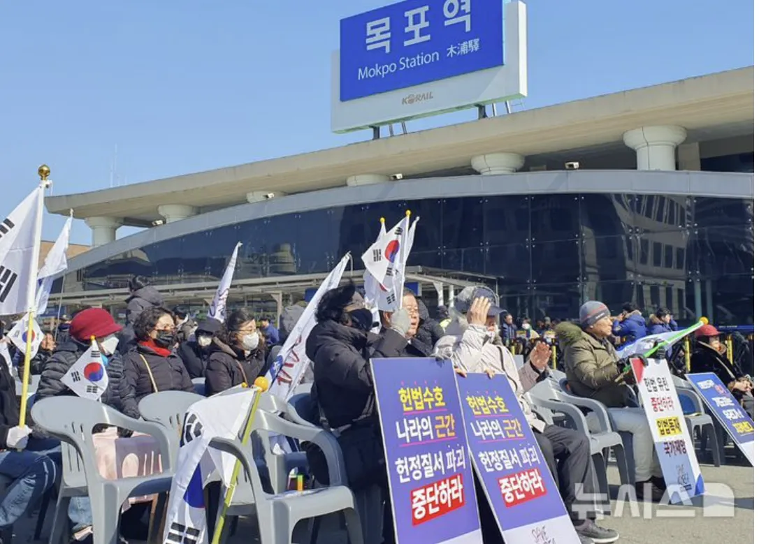 보수성향 기독교단체인 세이브코리아는 22일 오후 2시 목포역 광장에서 헌법재판소의 윤 대통령 탄핵 기각을 촉구하는 국가비상 기도회를 열었다.