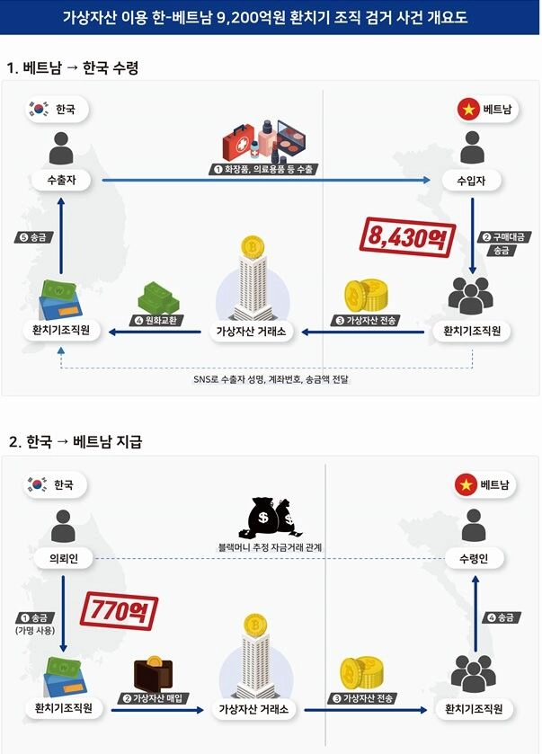 이 중 A씨 등이 한국에서 영수를 대행한 자금은 8430억원에 달한다. 또 베트남으로 송금을 대행한 자금은 770억원으로 드러났다. 세관은 베트남으로 흘러 들어간 돈이 도박이나 마약 등 범죄와 연관이 있을 것으로 보고 수사를 이어가고 있다.