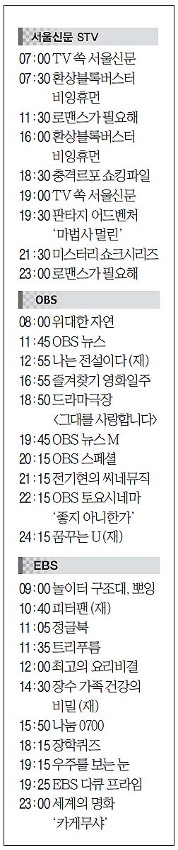 방송 [20일(土) 서울신문 STV·OBS·EBS] 입력 2013 07 20 00:00 수정 2013 07 20 00:22 기사 소리로 듣기 다시듣기 ⓒ 트윅, 무단 전재 및 재배포 금지