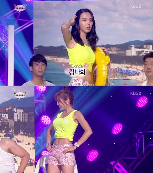 11일 방송된 KBS 2TV ‘개그콘서트’의 ‘…’코너에서는 해변가에서의 이야기를 다뤘다. 이날 엑스트라로 출연한 김나희는 꽃무니 핫팬츠에 노란색 탱크톱을 입고 무대에 등장해 늘씬한 몸매를 과시하고 사라졌다.