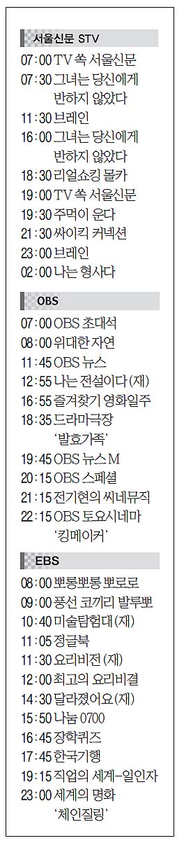 방송 [14일(土) 서울신문 STV·OBS·EBS] 입력 2013 09 14 00:00 수정 2013 09 14 00:18 기사 소리로 듣기 다시듣기 ⓒ 트윅, 무단 전재 및 재배포 금지