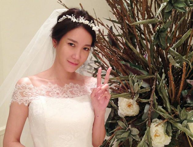 공개한 사진에는 웨딩드레스를 입은 이지아가 브이자를 그리며 카메라를 보고 미소짓는 모습이 담겨있다.
