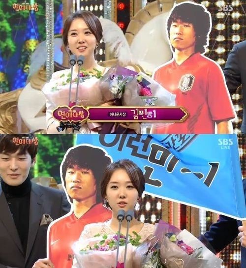 김민지 아나운서가 2013 SBS 연예대상에서 공개 연인인 축구선수 박지성에게 프러포즈를 받았다고 고백했다.