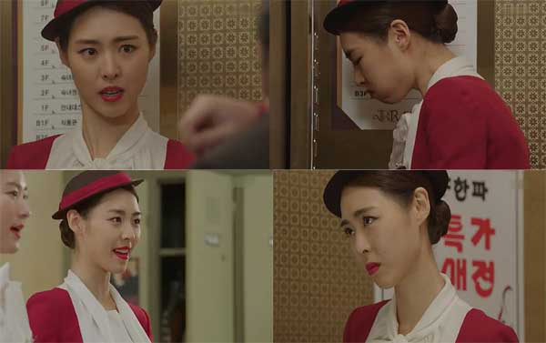 오지영에게 제대로 된 휴식공간이나 식사시간도 없다. 하루 종일 서서 일하니 다리가 저린다. 너무 배가 고픈 나머지 그녀는 엘리베이터 안 CCTV 사각지대에서 몰래 삶은 계란을 꺼내 먹는다. 너무 빨리 삼킨 나머지 목이 턱턱 막히지만 고객들이 타기 전까지 다 먹어치워야 한다.